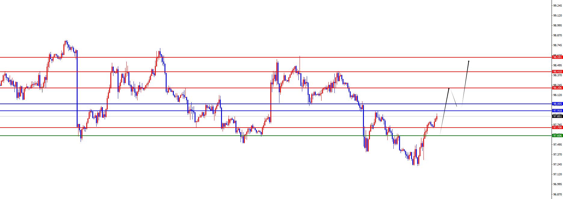 The US dollar index has a long range of 97.60-70, with a defense of 5 US dollars, and a target of 98.20-98.40-98.60