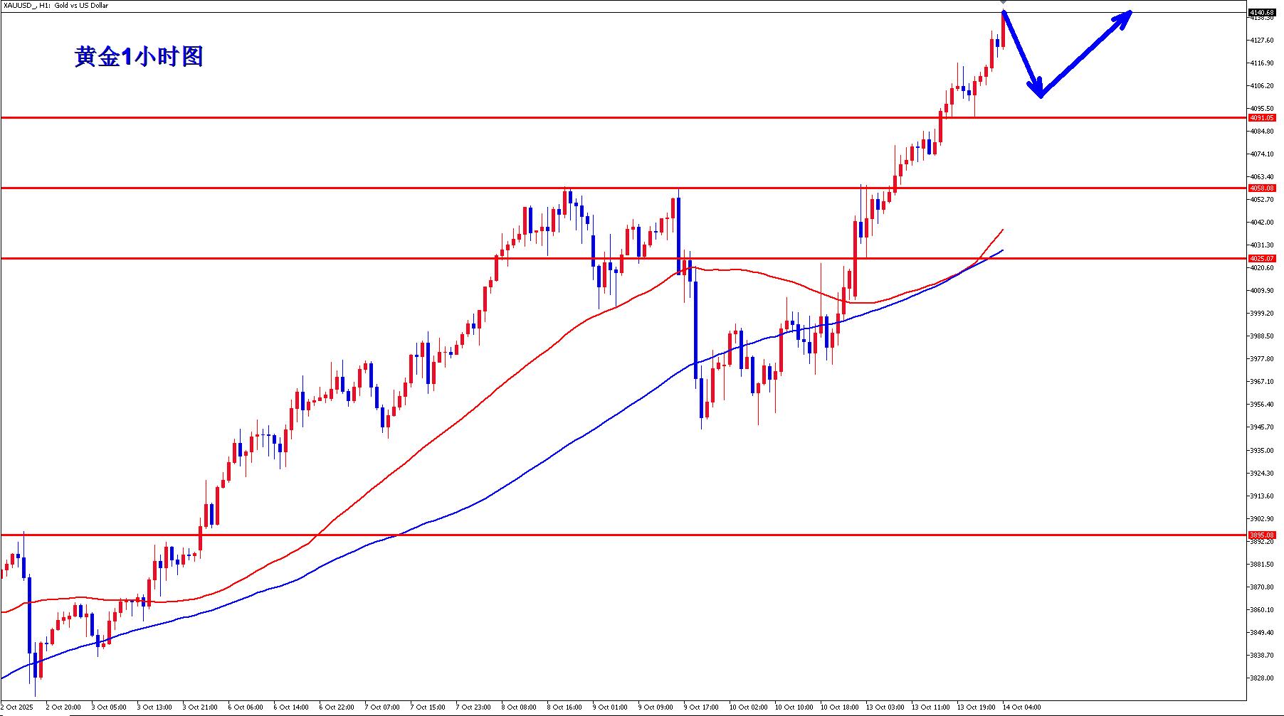 The 1-hour moving average of gold continues to disperse upwards. Gold bulls are still strong. Gold breaks through 4100 as scheduled. After that, gold falls back to around 4092 in the morning and evening and continues to rise. After gold falls back to around 4100 in early trading, it can continue to hunt for dips. Gold is now making new highs, and the fall is an opportunity to go long.