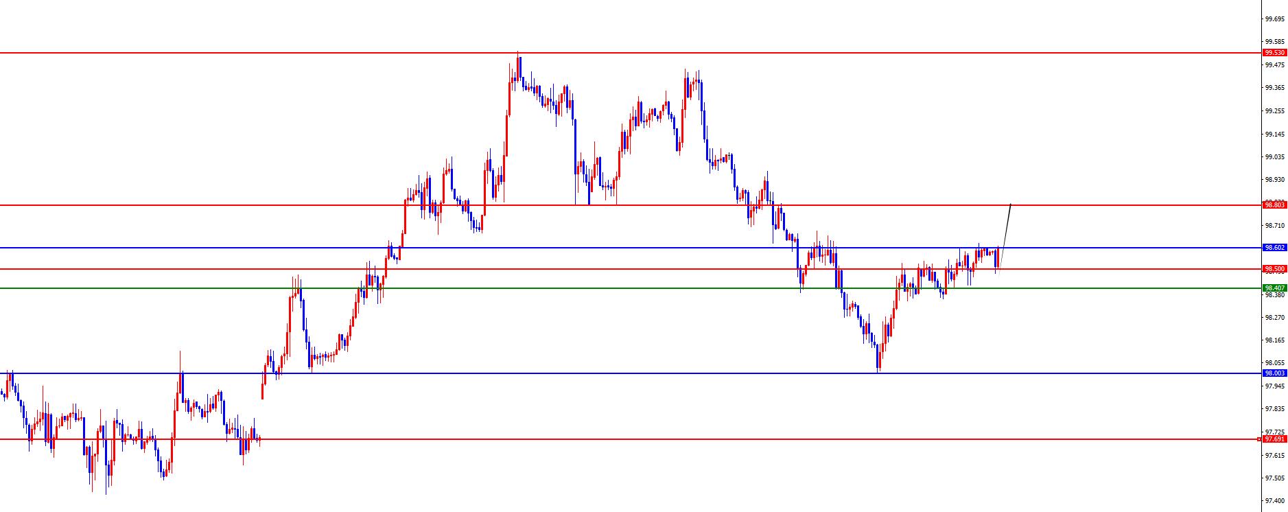 From a multi-cycle analysis, the weekly price stabilized last week after continuing to fluctuate in the early stage. Last week, the price stepped back on the weekly support position and fell. The current weekly support is in the 98 area. Follow-up attention will be paid to further mid-term bulls (need to pay attention to the gap position). From the daily level, as time goes by, the current daily resistance is in the 98.60 area. This position is the key to the band trend. The price has been consolidating up and down at this position recently. Short-term operations need to be cn.xmfx.mebined with small cycles. From a four-hour perspective, during the recent fluctuations, we found that the price relied on the four-hour key position. As yesterday's price broke through the four-hour resistance, this position became a key support. The position is temporarily focused on the 98.40-50 range. We will rely on this area to see further growth in the future. In one hour, the current price is also bullish, so we will focus on the bullish operation for the time being, and the upper side will temporarily focus on the 98.80 area resistance.