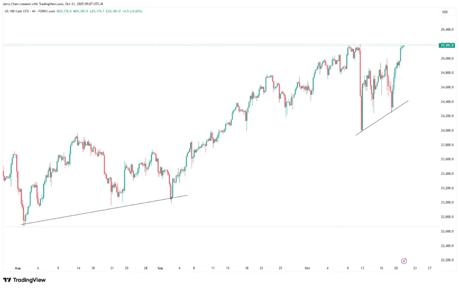 After a volatile adjustment in the past two weeks, the Nasdaq 100 index formed a bullish engulfing pattern on the weekly chart, and closed back to the all-time high of 25,200 again on Monday.