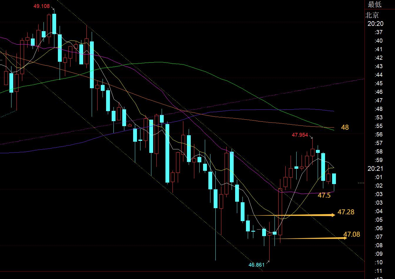 Second, in terms of silver: Yesterday, the Asian and European market fluctuated and slowly went down, and the journey was also very bumpy and highly repetitive. It finally fell to the 46.8 line, close to the weekly 10 moving average support and steadily bottomed out, and then fell back before closing in the middle of the night;