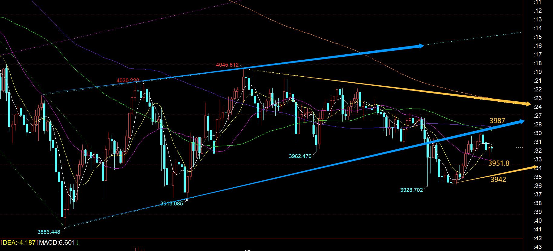 Second, the golden 4-hour level: the mid-rail resistance moves down to 3987, which happens to be the high point at this time of the day, and the annual average support moves up to the 3930 line, and tonight's operating range is probably within this range;