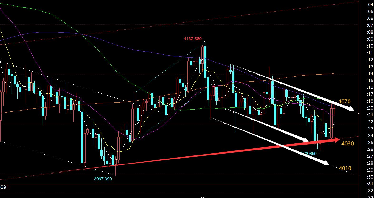 Then the 4-hour level of the year The moving average support still exists, and there are also multiple pin shadows; from the hourly level, in the Asian market pressure chart, the upper rail of the white channel 4087 has risen and fell back, which has been planned in the second half of the night; the European market continued to be under pressure and fell to the lowest 4023, with two needle insertions, piercing the lower rail of the red channel, and then running in the range of 4030-4070. At noon; tonight, focus on the upper track of the white channel, which moves down to the 4070 line, which is also the high point that rose rapidly in the previous hour. If the pressure here is not high, it will continue to fluctuate in the 4070-4030 range. If it suppresses the downward trend, the support will focus on 4046-40, which is the 618 division point where Dayang retreats, followed by 4030, which will stabilize and fluctuate.The limit is that if the daily line converges to the lower rail support of the triangle, pay attention to the stabilization of the 4010 first-line position; in addition, if the hourly closing station is effective at 4070, then the weak shock will turn into a strong shock, and the upper side may repeatedly test the 4100 mark;