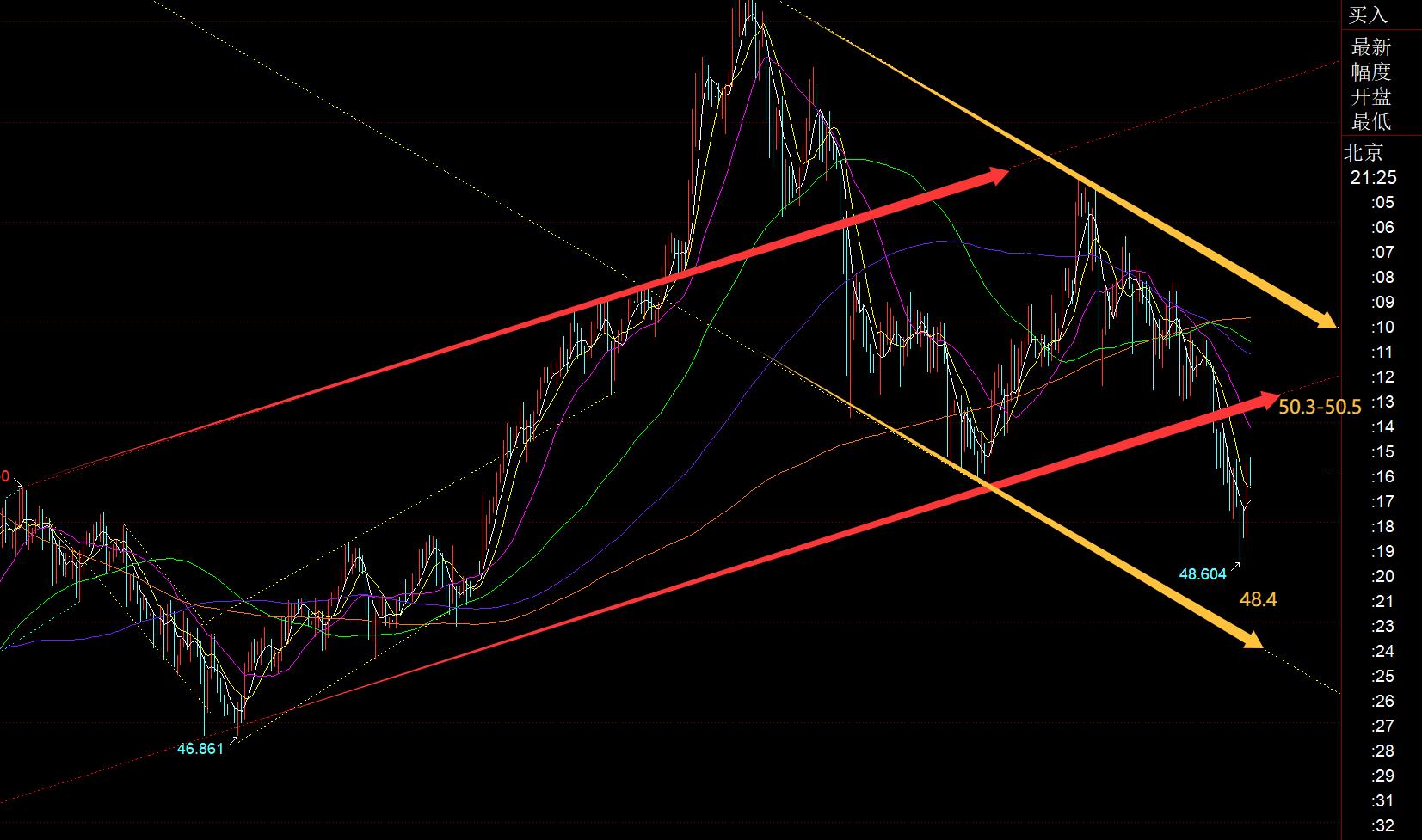 Silver: Silver is much weaker than gold today. The Asia-European market continues to fall slowly with almost no rebound. It directly inserts the daily trend support line, with a minimum of 48.6, approaching the weekly 10 moving average support of 48.4; then it depends on the closing situation in the late trading. If a long lower shadow can appear and close above 49.35, then it is still optimistic; however, the five-wave pull-up originally expected this week has basically failed, and the width has been adjusted. Treat it within reason; focus on the high and large range of 54.4-47.5; tonight, focus on the lower track counter pressure of 50.2-50.3 in the red channel, and pay attention to the pullback under pressure, support 48.4-48.6; if it returns to the red channel, it may return to the shock upward early next week, and is no longer too weak;