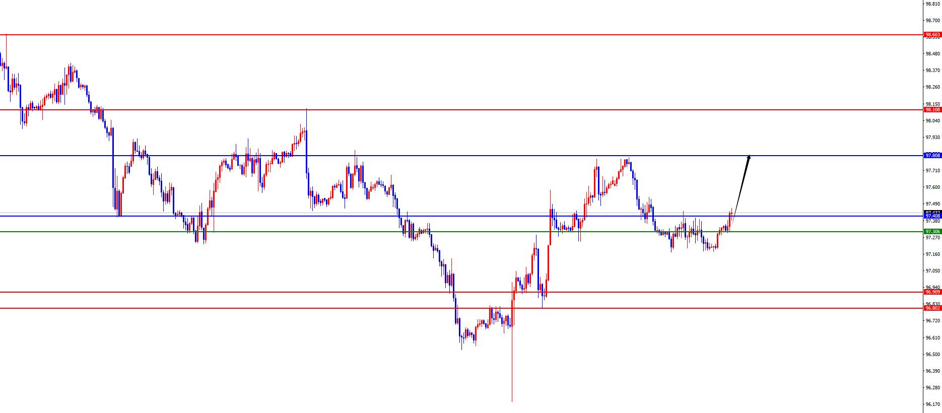 De un análisis de ciclo múltiple, el nivel semanal ha sido recientemente una consolidación clave en la línea semanal. Actualmente, la resistencia semanal se encuentra en el área de 97.80. Es importante prestar atención a si este puesto puede mantenerse firme esta semana. Una vez que se mantenga firme, los toros de mediano plazo continuarán. Desde el nivel diario, a medida que pasa el tiempo, la línea diaria se admite actualmente en el área 97.40. Prestaremos atención a esta posición para estabilizar y aumentar aún más. Desde la perspectiva de cuatro horas, la resistencia actual de cuatro horas es de 97.30. El precio actualmente perfora las posiciones de resistencia diaria y de cuatro horas a corto plazo. Prestaremos atención al continuo estacionario y se detendremos. Los Bulls de precios actuales continuarán en una hora, por lo que en términos de operación, siempre que el precio continúe siendo alcista por encima de 96.80, y en operaciones a corto plazo, puede continuar observando la continuación.