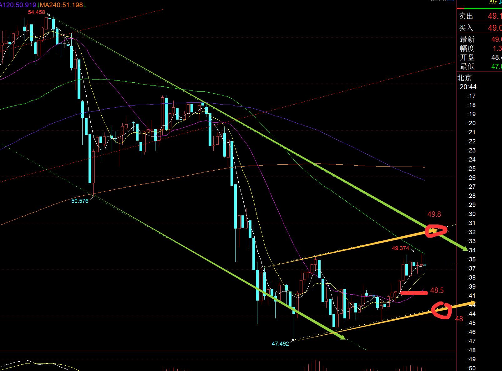 Il en va de même pour l'argent. Il s'agit d'une forme embryonnaire de consolidation du fond. Du point de vue du canal, la pression clé au-dessus est de 49,8, le support clé en dessous est de 48 et l'axe central est de 48,5. Traitez-le avec un choc, puis attendez que le signal passe ; s'il dépasse 49,8, le plancher à court terme apparaîtra également et les perspectives du marché augmenteront progressivement ;