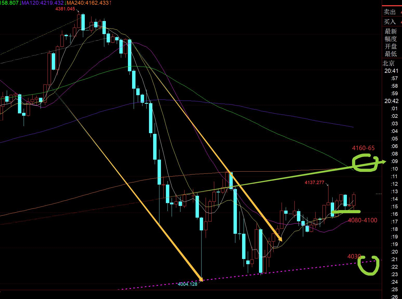 Deuxièmement, le niveau d'or de 4 heures : il y a plusieurs longues ombres K en bas, et le support d'achat à 4004 est encore relativement fort ; actuellement, la moyenne mobile de 10 a été cassée, et si 4090 peut être stabilisé, il devrait tester 4150 le 66.Même proche de l'orbite médiane 4180 ;