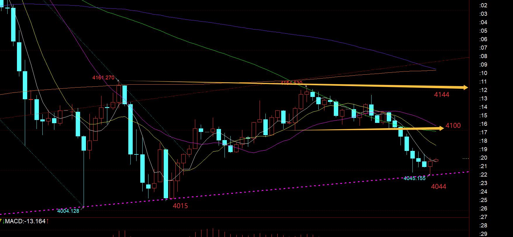 Deuxièmement, la moyenne mobile semestrielle de l'or sur 4 heures et la moyenne mobile sur 2 heures sur 66 jours résonnent et soutiennent la ligne 4044, regardez ses gains et ses pertes. ce soir, les 4 heures 5 et 10 se sont concentrées sur la ligne 4100, et la cassure d'aujourd'hui ici a déclenché une nouvelle baisse ; la résistance du rail médian est descendue à 4133, et la résistance du 66 est descendue à 4156 ; pour que ce cycle devienne plus fort, il est nécessaire de surmonter progressivement ces positions de résistance, le macd se prépare et attend à tout moment que la croix dorée en dessous de l'axe zéro apparaisse ;