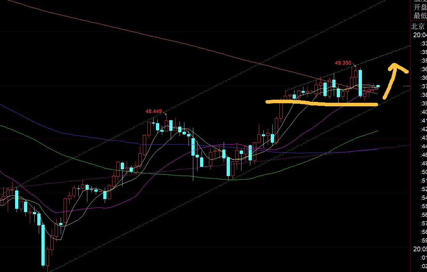 Argent : La ligne quotidienne est également un grand soleil, et elle s'est tenue au-dessus de la moyenne mobile 10 de 48,6, testant la pression médiane de 49,4 ; bien qu'il se situe à un niveau élevé et continue de s'échanger latéralement au cours de la journée, et que le plus bas de 48,65 soit maintenu, il reste optimiste quant à une percée à la hausse. Une fois qu'il atteint 49,4, l'espace supérieur s'ouvrira progressivement et le deuxième point culminant de 618 pointera vers la ligne 51 ;