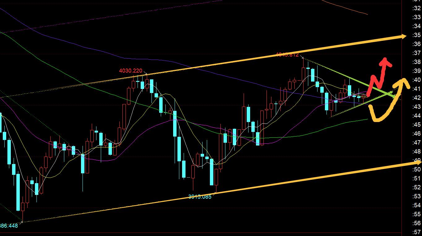 Troisièmement, le niveau horaire doré : il a clôturé fortement à un niveau élevé pendant la nuit et a continué de monter tôt ce matin, atteignant un maximum de 4047, approchant l'objectif de résistance de 4050 ; lorsque la ligne de clôture à 10 heures monte et retombe à K, cela signifie qu'il y a un choc et une baisse, et la première chose sur laquelle se concentrer est le milieu de la voie. À ce moment-là, le support 4002-03 a été touché pour la première fois par une vague de hausse rapide jusqu'à 4017. L'objectif à court terme attendu est 4020, ce qui est légèrement pire, puis a rapidement reculé. Il est difficile de tenir s'il dépasse les 4000 ; le deuxième support en dessous attend que 3980 continue de monter, mais le plus bas est 3988, qui est toujours sans laisser de chance, le soleil s'est refermé au-dessus de la trajectoire médiane, et 4000 a repris le rappel et a finalement atteint l'objectif de 4020 ; le marché européen a supprimé 4026 et est retombé, et se trouve maintenant dans la consolidation interne du petit triangle de convergence du graphique ; le support de la piste inférieure est actuellement de 4004, et la résistance de la piste supérieure est de 4018, et il est impossible de maintenir le marché européen à un niveau bas de 3998. Avant de percer, nous avons toujours tendance à fluctuer et à regarder vers le haut, car la ligne quotidienne est haussière en bas ; bien sûr, nous devons effectivement franchir le rail supérieur de convergence 4018 pour avoir l'élan nécessaire pour pousser davantage vers le haut ; s'il tombe en dessous de 3998, alors faites attention à la stabilisation du support de première ligne de 3980 ;