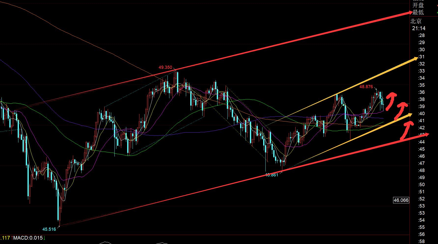 Argent : D'après l'image ci-dessus, il est également dans le canal ascendant du canal rouge, tandis que le petit canal est dans le canal jaune ascendant. Le support horaire intermédiaire actuel est de 48,35 et le support fractionné intrajournalier 618 est de 48,3. Tout d’abord, faites attention à la stabilisation de son support ; tandis que le support du rail inférieur du canal jaune est de 48. Il y a également un rebond stabilisateur à cette position. S'il est plus faible, ce sera le support ferroviaire inférieur du canal rouge 47.6 ; par conséquent, pour les chocs, faites attention aux signaux de soutien et de stabilisation de ces trois places ce soir. Si vous testez le bas et remontez K ou Dayang K, vous pouvez essayer d'intervenir et tester si vous reculez dans l'heure suivante. La résistance est de 48,85 et 49,4 ;