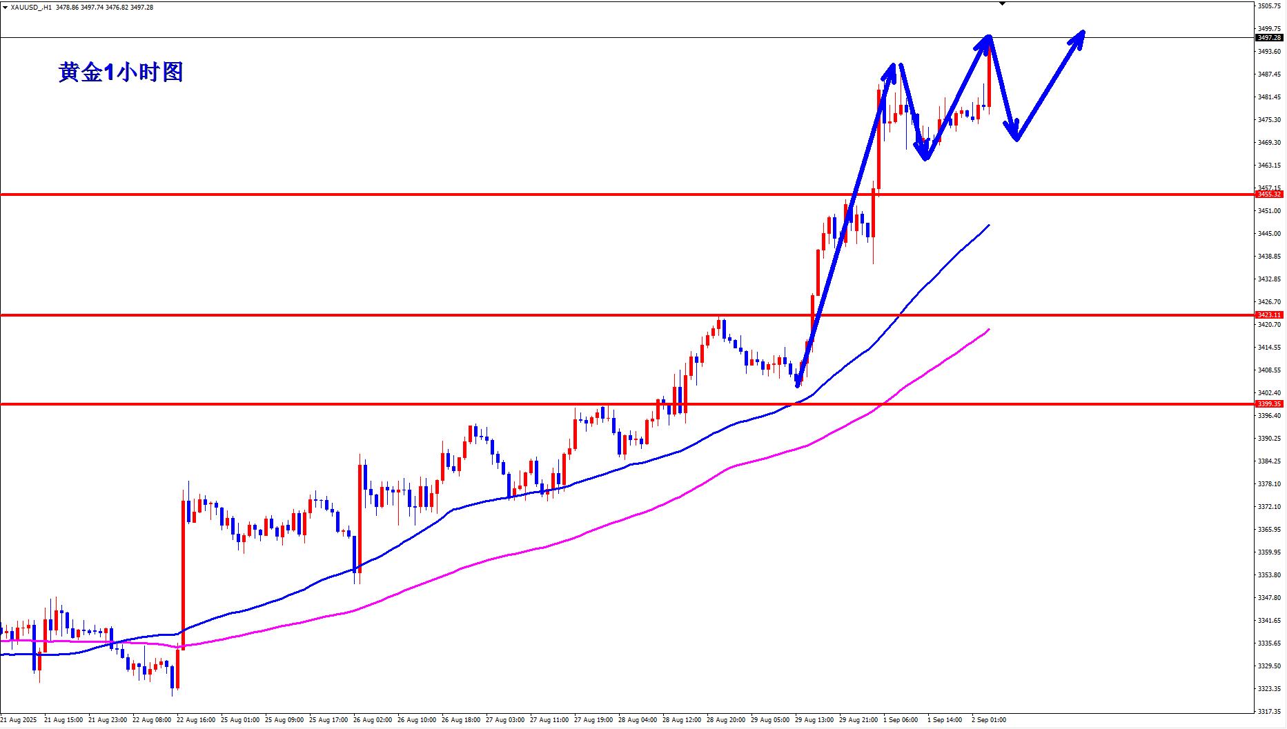 黄金1小时均线继续金叉向上的多头排列发散,黄金多头还是气势如虹,势不可挡,黄金即将突破3500一线历史高点,如果继续突破历史新高还有望加速上涨,黄金昨天突破之后开始震荡,黄金震荡的低点3466一线不破趋势还是多,黄金早盘回踩3466上还是逢低继续多。如果黄金直接突破3500一线,那么也要等待稍微回踩再继续多。