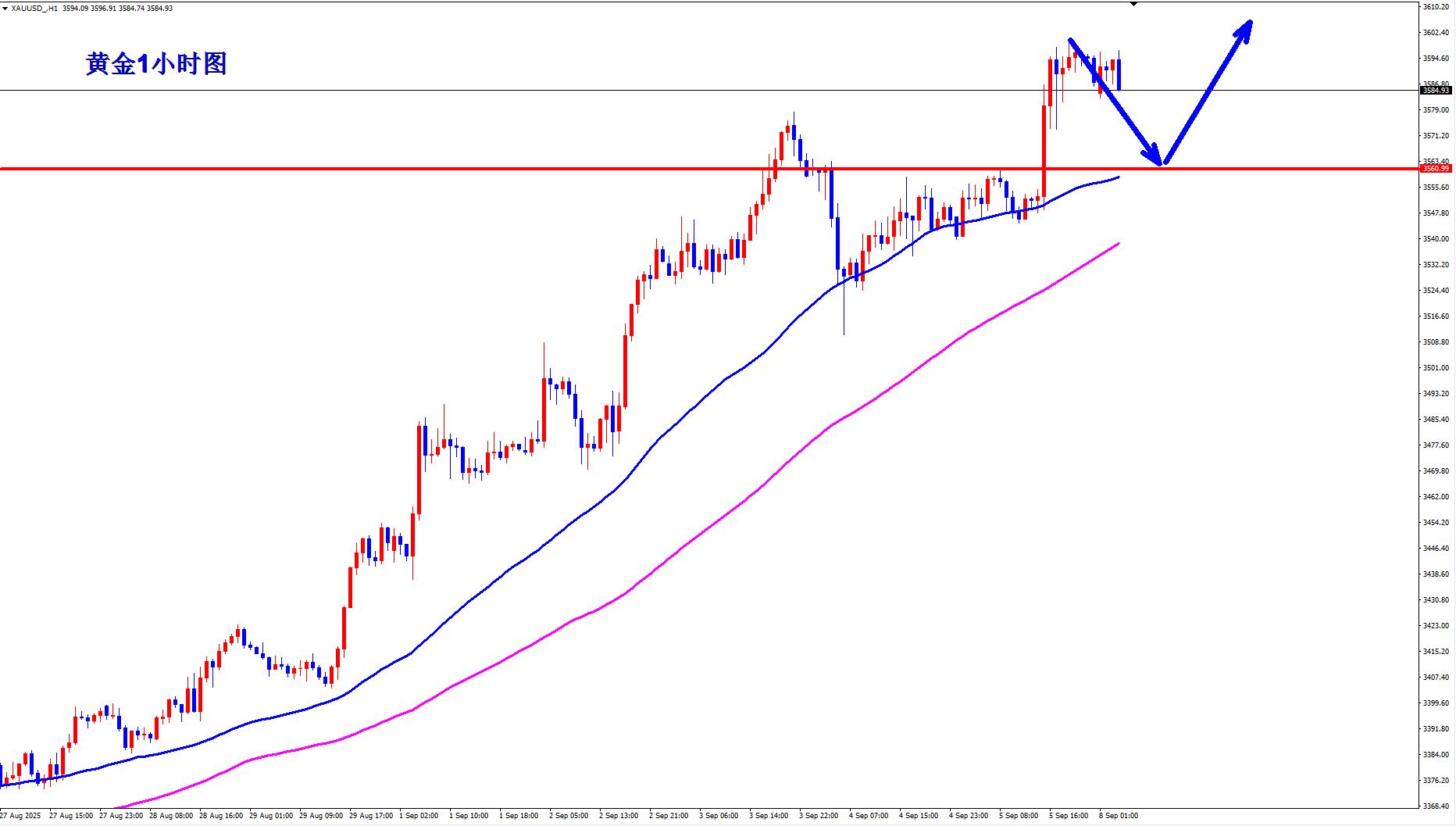 黄金1小时均线还是继续金叉向上的多头排列发散,均线支撑也上移到3560附近,黄金3560也是短期的多空转折位,黄金早盘回落3560上继续逢低做多。黄金现在还是标准的多头趋势,震荡之后直接向上突破,黄金周五大非农之后触及3600一线整数关口短线压制,黄金只要不出现过大的回落,还是在3560上方震荡,那么就是为了蓄势突破3600一线做准备。