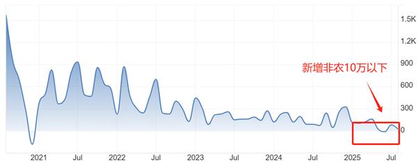 然而,2025年以来,美国的新增非农就业人口经常跌至10万人下方,且数值极低。8月份的2.2万人已经低到震惊市场,但今年6月份新增非农人口曾跌至负值,为-1.3万人,5月份也出现过低于2万人的数值。如果只考虑就业数据,可以推断,美国宏观经济已经陷入衰退,且衰退迹象已经非常明显。