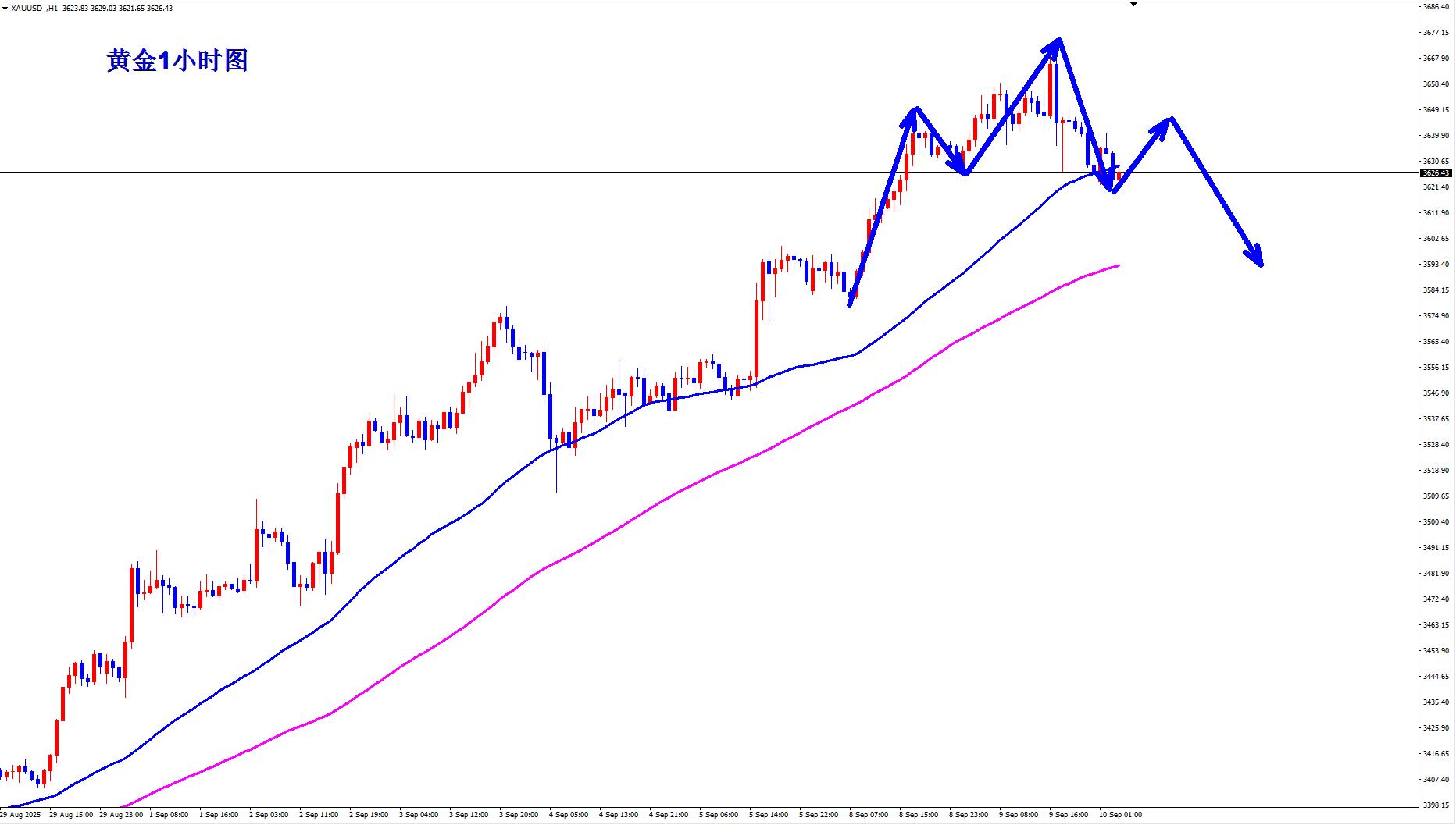 黄金1小时跌破均线支撑,高位开始有头肩顶结构的形态的雏形,黄金1小时头肩顶形态左肩3646附近,黄金昨晚数据后下跌二次反弹到3650附近承压回落,那么黄金右肩如果承压3650附近,那么黄金可能形成右肩,黄金早盘反弹承压3650附近可以继续空。