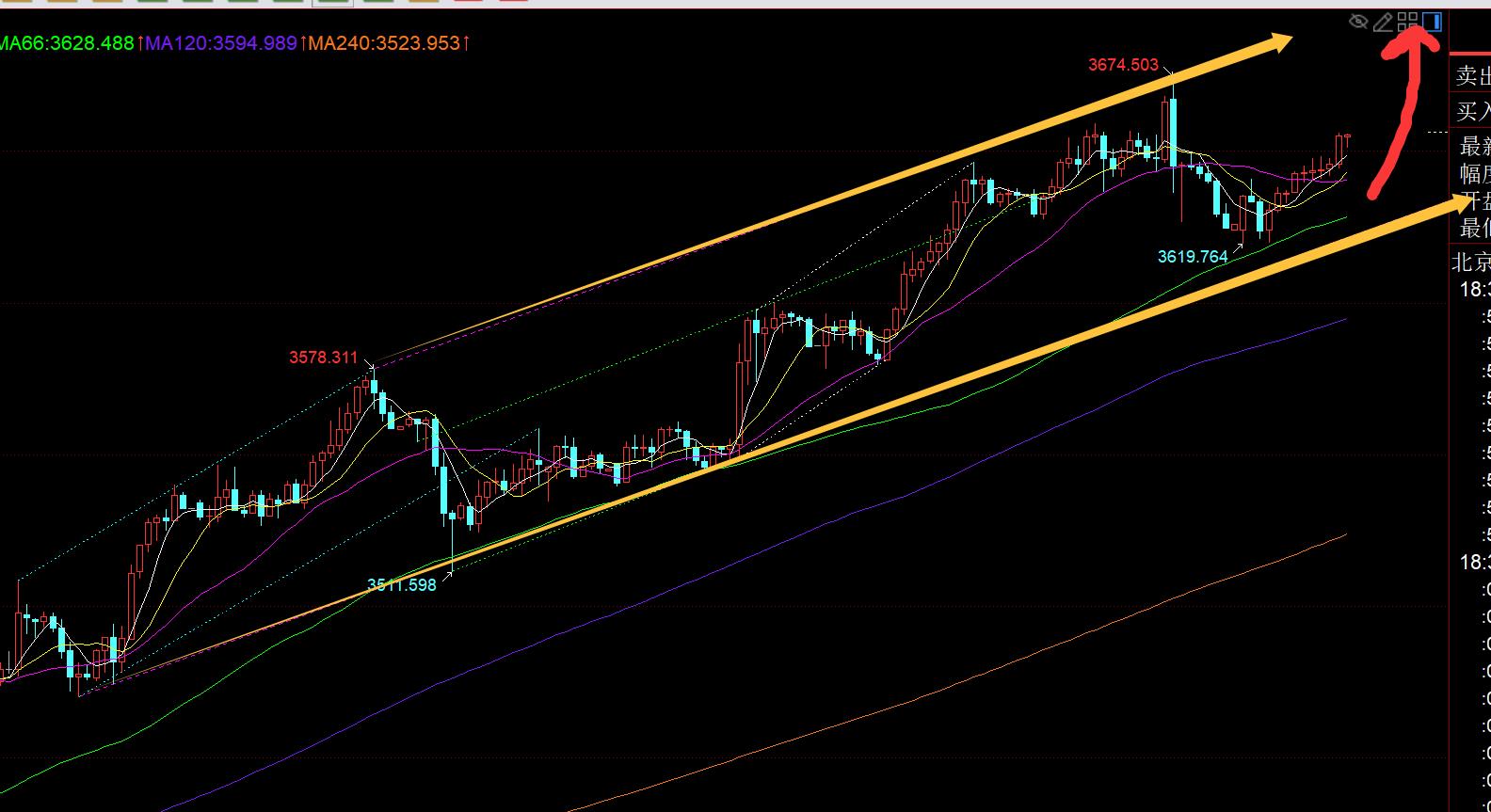 第三,黄金小时线级别:从上图通道分布看,其实昨晚触及3674时,是看到它触及了通道上轨,且22点消息提前消化了,一旦公布后出现卖事实的一波回落也很正常,这也是为什么3673提示果断全盈利收米的原因,防止承压上轨短线跳水,但作为这轮强势单边趋势看涨来讲,就要牢记只多不空原则,即便看到有回调需求,也放弃抓回调,只要在关键阻力位盈利收割手中看涨仓位或减持即可,回踩一波继续看涨或补上仓位,因为操作过程中,节奏是非常重要的一环,保持好节奏,整体就会一路顺畅,心态也会一路保持最佳,就可以一路跟随住这波多头;今日早间比较可惜的是,计划靠近图中通道黄色通道下轨位置,也基本靠近3580-3673回踩的618分割点3616一线去尝试低位波段看涨一次,但市场不给机会,差4米左右;10点收阳之后,就一路连阳碎步慢涨,突破中轨3640后,也提示若能回踩3630之上可继续上攻测试3653-58,而此时目标基本又到位了,但入场点不给任何回踩机会,除非是直接追涨,但这个又不是笔者稳健的手法,只能选择踏空看着它拉升,不过手中一直持有多个低位底仓看涨仓位,也是蛮舒服的;今晚支撑上移3630,靠近66日均线和日内涨幅的618分割位置,触及继续看涨,以日内低点作为风水岭防守,上方关注3653-58,一旦重新站上3660,那么不排除昨日高点直接突破,再去测试通道上轨基本就是3685之上了;