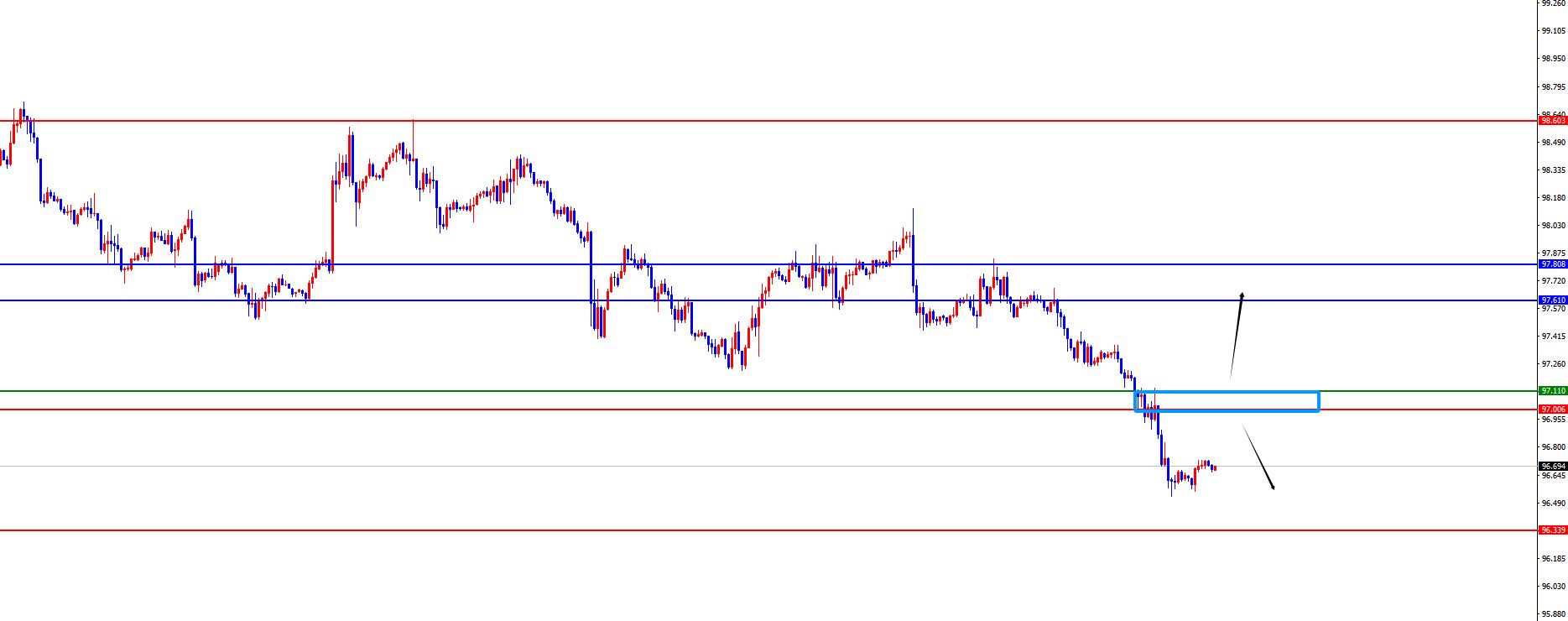 从多周期分析,周线级别来看近期价格在周线关键上下盘整,目前周线阻力于97.80区域,价格在此位置之下偏空对待,价格只有后续周线收盘在此位置上方才会转多。从日线级别看,随着时间的推移目前日线阻力于97.60区域,价格我在此位置之下波段空,针对后续需要关注价格能否站稳日线及周线共振阻力区间是关键,只有站稳才会上涨,否则持续承压。从四小时上看,经过近期美指震荡承压看,目前四小时阻力于97.00-10区间阻力,同时目前接近近期低点位置,所以空也需谨慎,重点关注四小时阻力得失,一旦上破则需要谨防拐头上涨。目前四小时阻力作为短期分水岭位置。日内多看少动,静待数据后的指引。