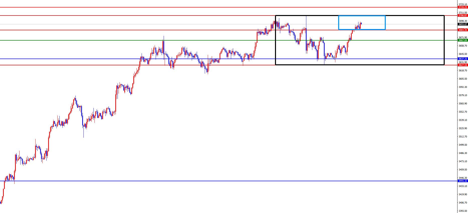 从多周期分析,首先观察月线节奏,月线上价格8月份大阳收尾,整体看价格依旧多头运行,从长线上看3000位置是长线走势的分水岭,价格在此位置之上长线多对待即可。从周线级别看,价格经过近期持续震荡后突破关键阻力,目前持续再创历史新高位置,目前周线多空分水岭于3441位置,价格在此位置之上中线多对待即可。从日线级别看,暂时需要关注3637区域支撑,此位置之上波段多对待。从四小时上看,上周五价格突破四小时阻力,则短线价格偏多,但是目前市场有在3627-3707区间震荡,所以在没有突破前期历史高位之前也要谨慎对待。下方3665位置为短期走势分水岭。一小时上价格目前多头还没有节奏,早盘低点成关键,所以目前短线先关注早盘低点及前期历史高位区间得失,打破此小区间才会进行延续,所以目前多看少动,待价格打破小区间后进行看延续。