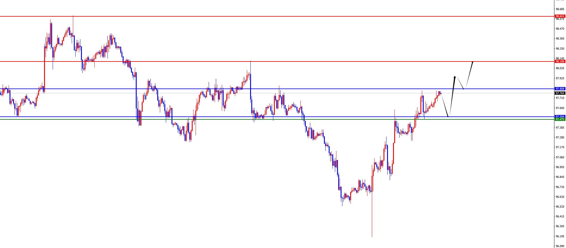 从多周期分析,周线级别来看近期价格在周线关键上下盘整,目前周线阻力于97.80区域,本周需要关注此位置能否站稳是关键,一旦站稳则中期多头将进行延续。从日线级别看,随着时间的推移目前日线支撑于97.50区域,价格目前进行上破,后续关注此位置支撑进一步看上涨。从四小时上看,在上周三隔夜期间突破四小时阻力,之后价格依托四小时支撑上涨,目前看四小时支撑于97.50位置,价格在此位置之上目前持续看多,后续重点关注周线阻力的实际站稳。短线一小时上价格震荡上涨,目前重点关注97.50-60区间支撑看上涨,一旦突破周线阻力则后续持续看延续。