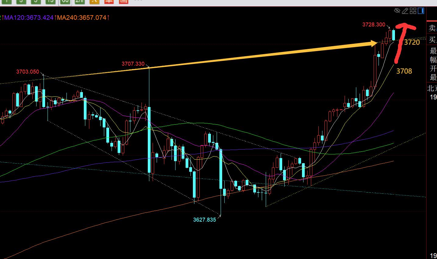 第二,黄金4小时级别:3627底部支撑后,一路连阳单边走高,非常强势,延续5均线势不可挡,当前5日支撑上移3704,此位置上继续保持看涨,今晚首要阻力目标关注3734,它是周视频提及的,3500-3120调整之后斐波那契扩展1.618倍位置,其次是3746、3783,都是很早以前通过浪形所推导的高度,一步步上看,中途难免会遇到突袭的下跌修正,但不影响它趋势一路上攻,下跌就是给上车的时机;