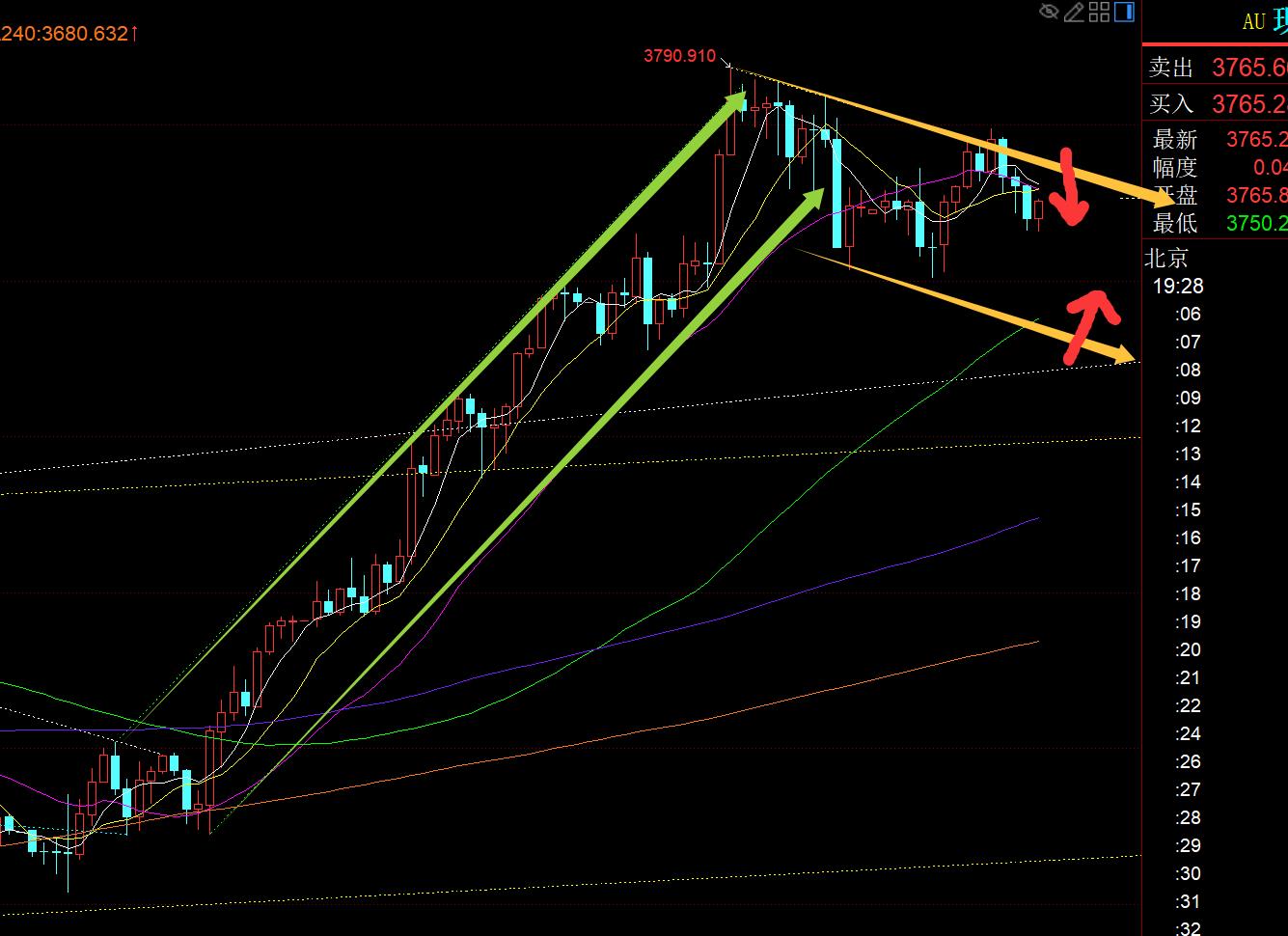 第一,黄金方面:前日隔夜强势拉升于高位,昨日早间依托3740上直接看续涨一波,成功抵达3755;午后回踩一波,依托短期通道下轨支撑,以及小时线中轨之上稳定,3740上继续看涨,再次成功抵达3758;欧盘企稳618分割支撑3748一线后,3753第三次继续看涨,顺利突破站上3760发力破高,抵达3783;美盘回踩3765上看二次上拉,力度不大,也给到了3785位置,逢高再次拿下;