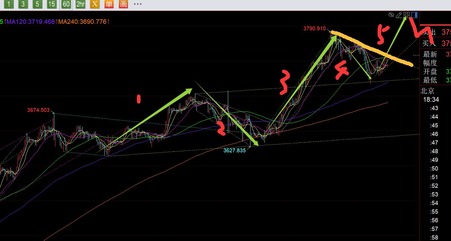 第三,黄金小时线级别:今日早间就给出上图,根据近期走势结合浪形推算,当前正在进行的是这一波的第五浪上涨,高度计算下来是3825一线;原本隔夜下跌一波,今日早间先反弹,对于震荡走法,一早延续性是差的,期待能二次回踩确认隔夜低点3720进行双底企稳去跟随看涨一波,比如昨日早间的走法;但可惜市场不给这个机会,欧盘低点3730一线提前出现企稳,欧盘连阳拉升发力冲击当前黄色趋势阻力线,一旦突破站上此线,就会向上发力一波上冲;因此当前价格3757-58比较重要,能大阳或连阳站上它,就有望冲击3780、3790,甚至直接突破3800关口;下方支撑3750,极限中轨3743,今晚要上拉,最好不能再跌破失守中轨,否则容易继续压制震荡;