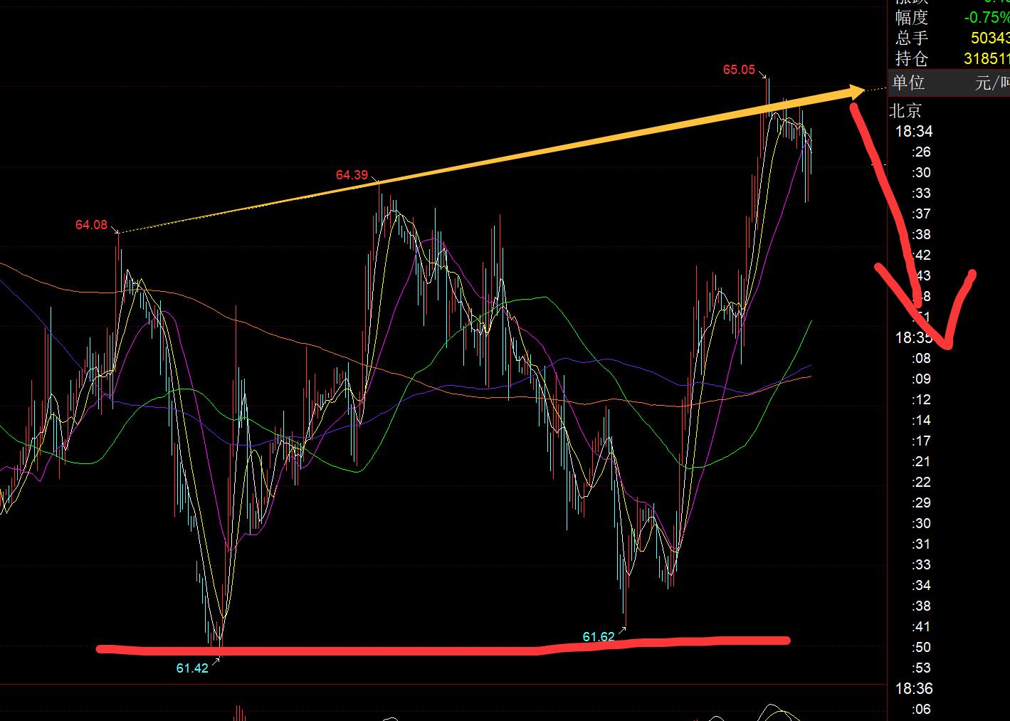 原油方面:日线仍处于区间性整理,从上图看,黄色趋势阻力线有所承压了,今晚64.9之下看跌回落一波,下方支撑63.4、61.4;