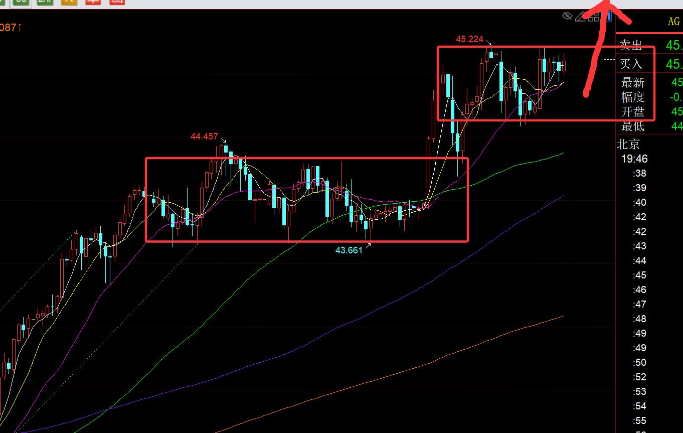 第二,白银方面:白银的走势依旧强于黄金,今年它还真的有望出现间隔15年以来的单边强势补涨,有望冲击50关口;昨日本计划43.6、43.3去看涨,早间未给到机会,欧盘直接强势猛涨刷近期新高,美盘则二次跟随看涨,依托顶底支撑44.3一线,最终成功抵达45目标,最高45.2,比较给力,基本上这一波就挽回了黄金欧盘追涨的损失;