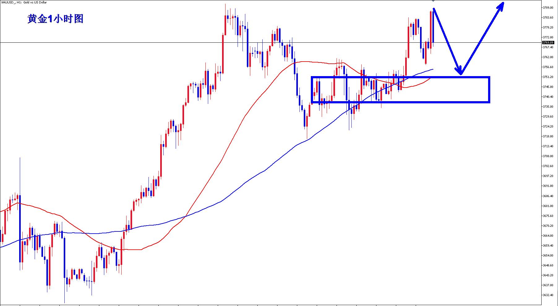 黄金1小时早盘继续上冲,不过早盘急涨不要轻易追多。耐心等待回落机会,毕竟早盘冲高也并未创新高,仍需耐心等待回落机会。黄金小时前期成交密集区域支撑在3745-3750区域一带,那么黄金早盘回落这个区域支撑可以继续逢低多。