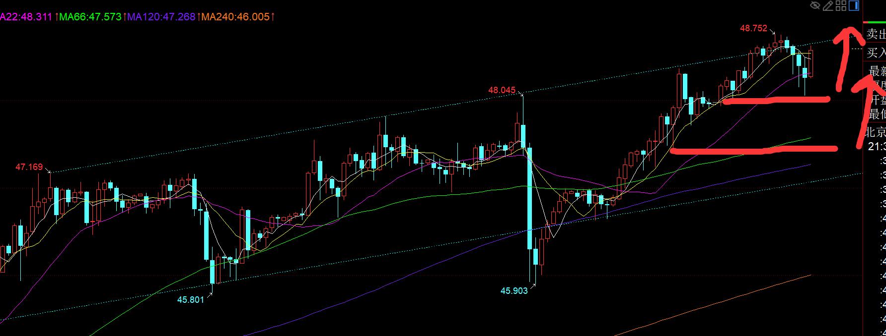 白银方面:白天突破了图中蓝色通道上轨,但可惜并未直接站稳,向下回踩了一波,刺破了中轨支撑,此时又阳线拉升,那么中轨位置依然支撑有效,今晚关注48支撑,再往下极限是日线5均线47.5-47.4支撑,都是选择企稳继续看涨,阻力目标本周初往49.7前高去看;