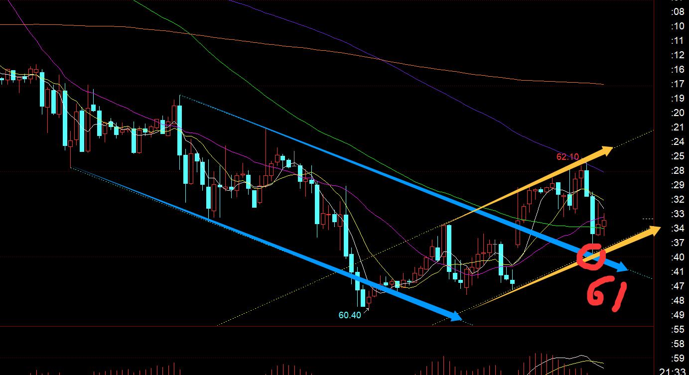 原油方面:早间跳空高开拉升一波,但欧盘并未延续拉升,所以今晚还需继续观察;从图中通道分布看,61一线属于两通道共振支撑点,看今夜能否一直稳住此位置之上运行,再考虑去看一波超跌反弹;若守不住61,那么就要回补缺口,届时60之上稳定再去等企稳的形态了;