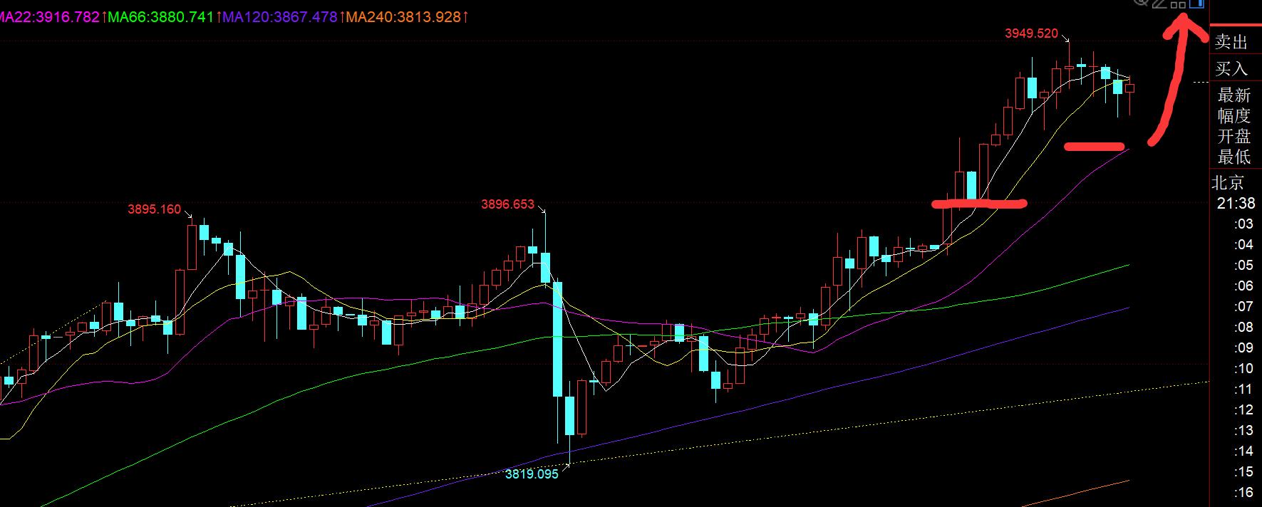 第二,黄金小时线级别:早间开盘直接一波猛冲拉升,站上3900冲击3920一线承压,回踩一波至3899一线再度企稳一路连阳拉高至3940之上,可惜3897-96顶底支撑并未给到继续看涨的机会,略差两三米;午后承压3945回踩一波,企稳10均线出探底拉升K,则继续跟随看涨,成功抵达3950一线;欧盘回踩二次触及10均线企稳再次出长下影企稳K,但这次并未延续破高,而是向下失守了10日位置,虽是下滑了,但过程并不干脆,因为它破前面长下影低点之后,又容易反复拉高,再下去;所以整体并不弱,只是暂时要处于高位一定区间内的横盘震荡了,来缓冲一下白天70米拉升的动能;既然由逼空拉升转为震荡了,那么以当前高低点进行分割划分,382分割位置是3924,50分割位置是3916,618分割位置极限是3908,结合中轨支撑3916上移此处,今晚触及3916附近企稳可再尝试看涨,极限3908上看涨,阻力目标再看3940-3950高位;若价格无法下滑给到低位支撑,向上又重新站稳3940,那么再考虑提前去看涨,阻力目标就是看新高去了;
