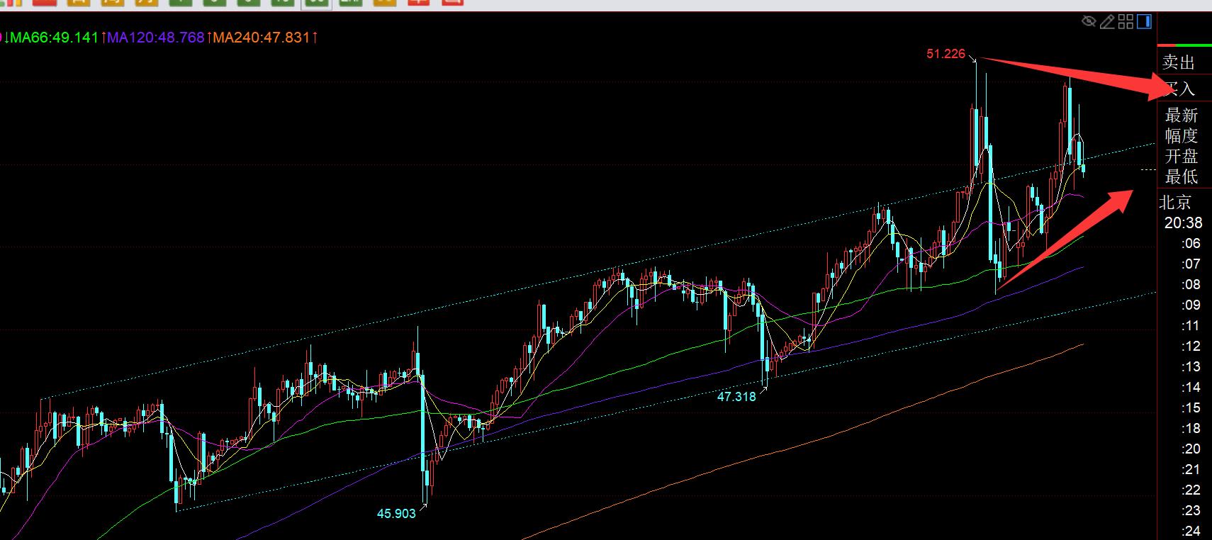 白银方面:昨日先加速拉升至51.2,后半夜冲高回落,日线收报长上影K,但仍企稳5均线之上,今日依托5日二次向上冲击51仍冲高回落,这也是相对正常,因为这两日的波动算是贼大的,它需要通过盘整来降低波动率,通过盘整来消化修复一些不利上涨的指标;今晚关注图中小三角,下方支撑49.3上,上方阻力51,区间内运行整理;