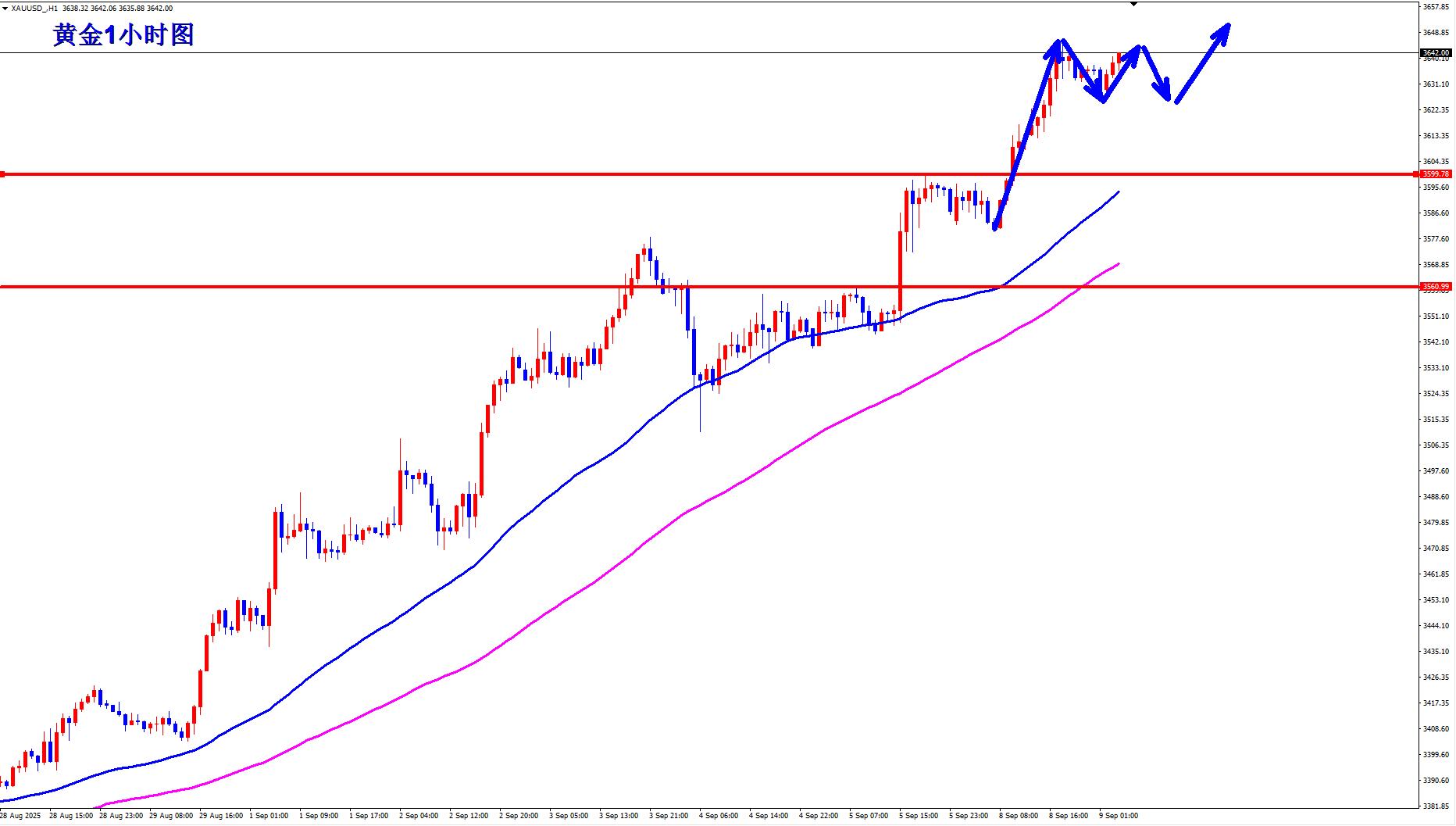黃金1小時均線還是繼續金叉向上的多頭排列發散,黃金昨天突破3600一線之後就開始繼續向上,昨天我們文章也說了,黃金只要不出現過大的調整,那麼黃金多頭就是蓄勢在突破3600一線的壓制;黃金突破站穩了3600,那麼短線3600將成為黃金重要的支撐。這種強勢行情,那麼一般回落20美金左右就還會繼續強勢,早盤回落3620附近繼續順勢逢低做多。