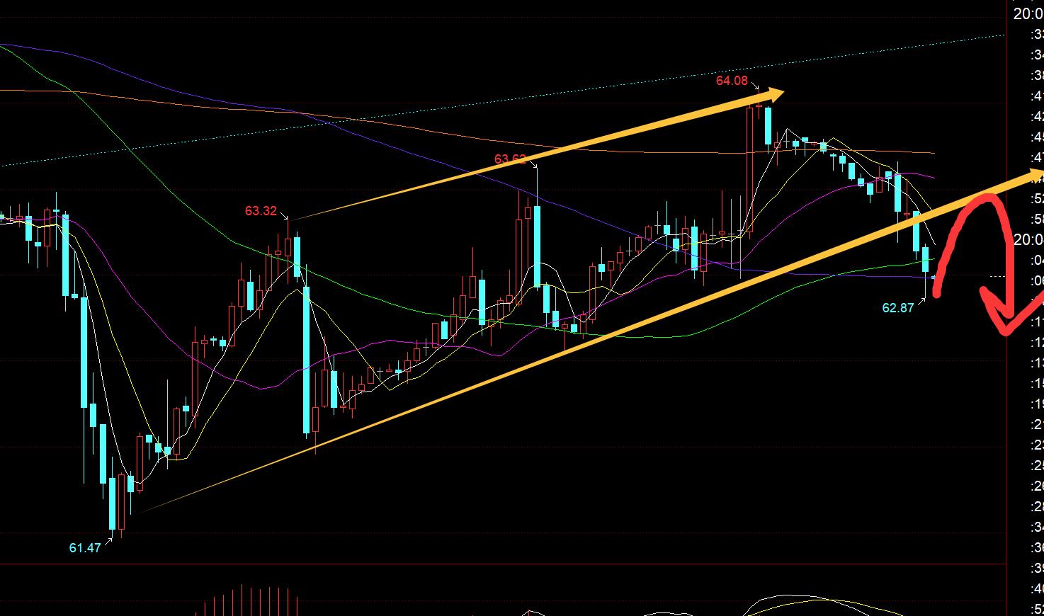 原油方面:昨日提及震盪反彈後,留意64一線承壓下滑,目前來看是符合的;今日下破圖中通道下軌,今晚反彈還是留意壓制情況,63.5之下;