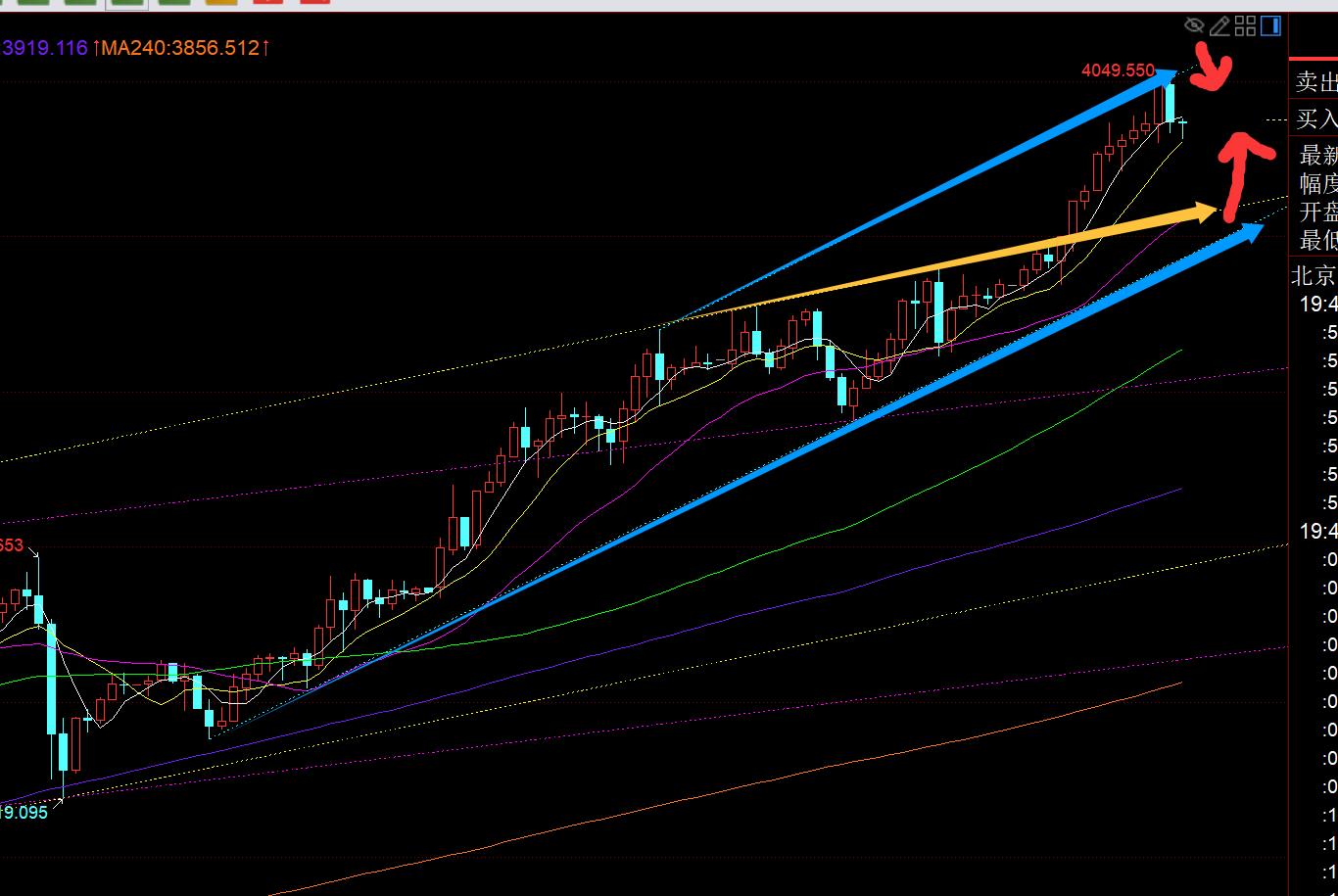 第三,黃金小時線級別:隔夜強勢收盤於高位,今日一早又是循環直接續漲,只有六七點開盤才敢直接追漲,看的晚了,後續就不太敢了,尤其是突破4000還一直連陽逼空往上,不給任何的回踩機會,就擔心它急速上拉,高位接盤而出現瞬間跳水獲利盤;19點收報頂部陰K,勉強有所包前一根陽K,但10均線4030支撐還在,且連陽過程中,首次出陰,還不能判斷馬上會延續下調;歐盤是繼續維持上漲破高,今晚還有二次拉升,若二次拉升仍壓制4050或刺破4050後再回落收一個承壓K,那個時候再考慮看一波回調修正;若它是先回調一波下去了,則依託中軌4005之上企穩去看漲,做二次拉升準備;如果想要大回調,就必須再失守4000關口向下跌,才可能會試探日內低點或刺破,這種概率暫時希望不大,先一步步去看;
