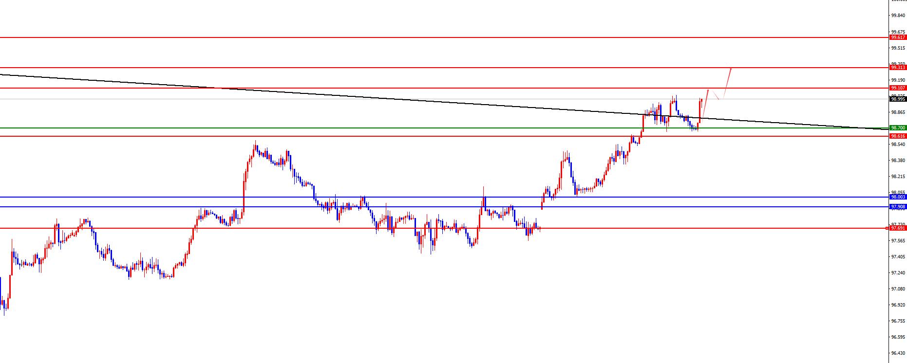 從多周期分析,週線級別來看近期價格在周線關鍵上下盤整,目前週線支撐於97.90區域,後續持續關注價格週線收盤在此位置上方,一旦收盤在此位置上方則後續將中線發力上漲。從日線級別看,隨著時間的推移目前日線支撐於98區域,價格此位置之上波段進一步上漲。從四小時上看,在上周初價格承壓於四小時阻力位置,在上週四價格突破上漲,之後周五再度回踩至日線及四小時支撐,整體目前四小時支撐於98.60-70位置,價格在此位置之上短線維持多。一小時上價格在昨日強調的趨勢線附近震盪,目前短線依舊偏多,所以暫時在四小時支撐沒有下破前維持多,只有下破後才看回補缺口,暫時先俺右側交易方式對待即可。