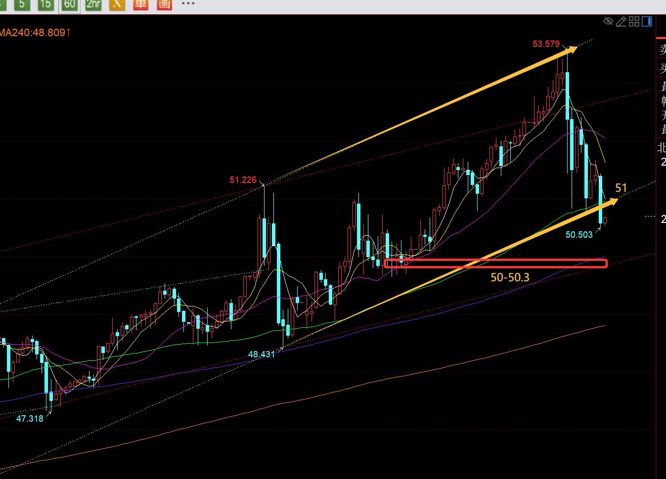 白銀方面:歐盤震盪打壓一波,觸及圖中黃色通道下軌51支撐,反彈了一波,隨後又打壓破了新低至50.5,這個位置逐步靠近日線5均線50.3;因此,白銀來講,它有些一步修正到位的跡象,而日線只要維持5日之上,依然是強勢單邊慢漲拉升中;因此,今晚留意50.3上下企穩看漲反彈;或者重新突破51,回到黃色通道之內,再回踩確認下軌企穩去跟隨反彈震盪,阻力52下;