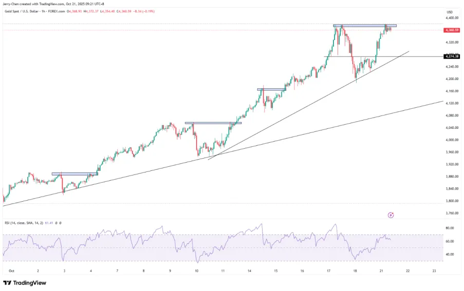 10月形成的三重底形態(4小時圖)與8-9月相呼應,暗示延續上行的可能性。而美聯儲下週的降息預期和強勁企業財報則是消息面的利好。