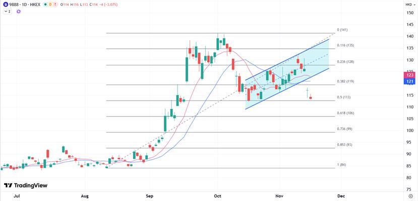 百度績前的股價仍偏向相對低位的整理,跟隨近日科技股的承壓勢頭,如果業績帶來利好,則關注是否重返均線上方指向124至132港元目標位。但如果業績加速其下行壓力,則關注會否進一步測試108至100港元的支撐。