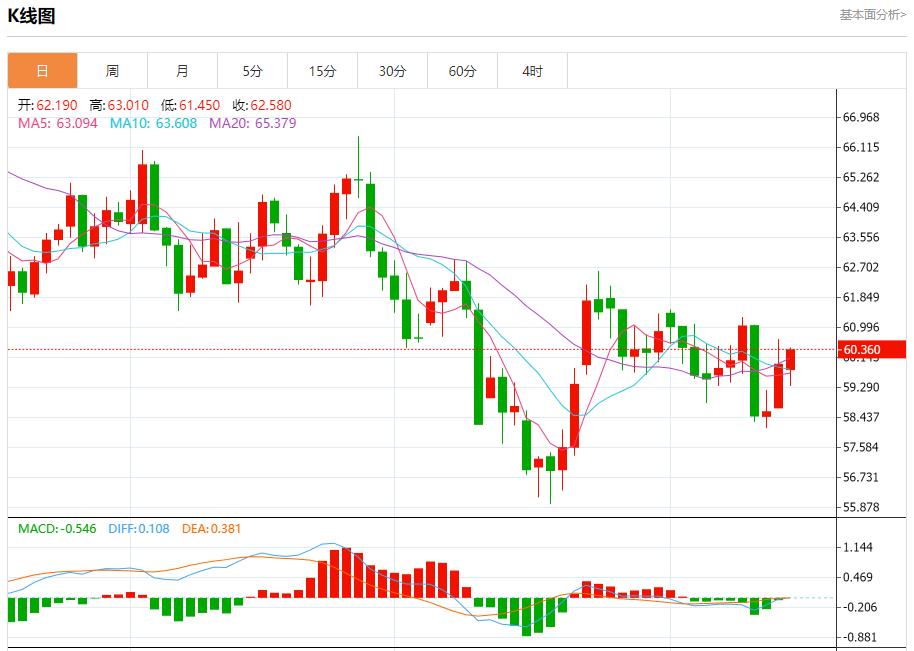 原油市場:截止北京時間21:20,美油上漲,現報60.340,漲幅0.43%。紐市盤前,(原油)的價格在最近的盤中交易中收盤大幅上漲,受到相對強弱指標出現正面信號的支撐,價格圍繞其50日指數移動平均線波動,同時在短期內在小幅看跌通道範圍內交易,這減少了價格在近期完全回升的可能性。
